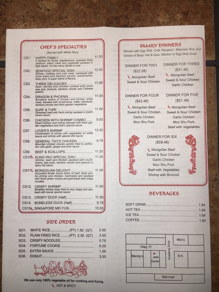 Welcome to Jade Garden Chinese Restaurant, a hidden gem in Bessemer, AL, where fresh flavors and comforting ambiance await. The menu features a delightful array of traditional Chinese dishes, crafted with care to ensure quality and taste. Diners rave about the Szechuan Chicken—cooked to perfection with vibrant vegetables and expertly balanced heat. The house fried rice and egg rolls are also standout choices, offering a satisfying blend of textures and flavors.
